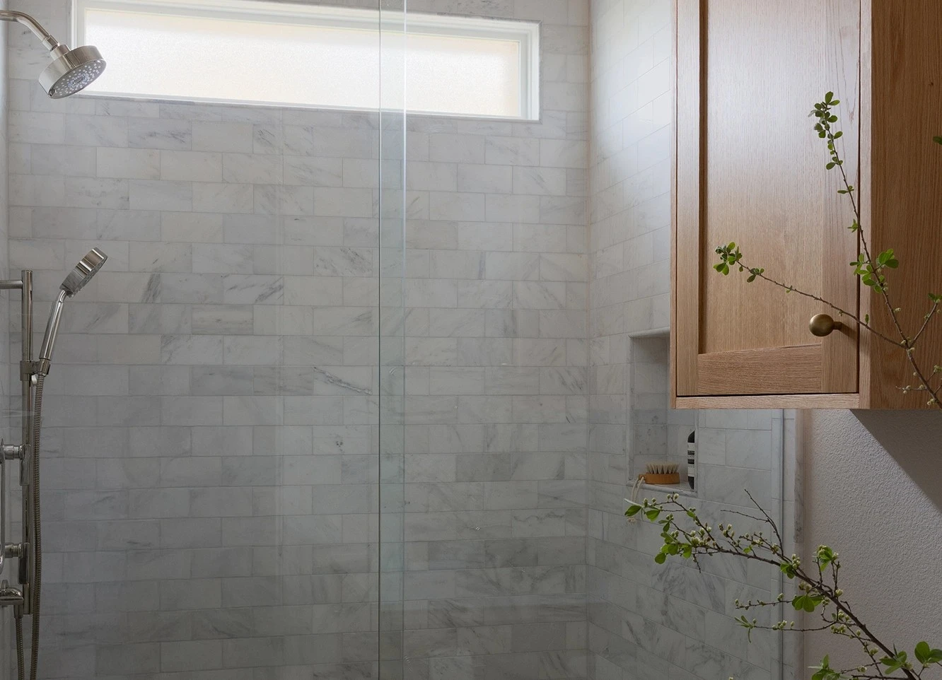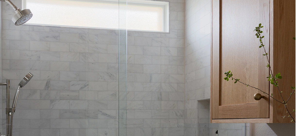 In the primary bath, we installed multiple shower nozzles and body sprayers for a spa-inspired experience. The daughter’s bathroom was redesigned with a brighter palette, graceful finishes, and a custom inset storage niche.